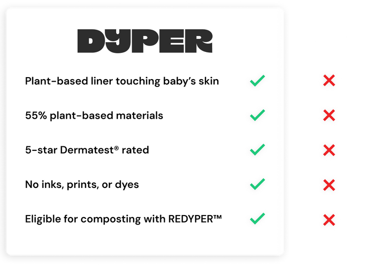 Dyper diapers have a 100% plant-based liner touching your baby's skin for zero rashes