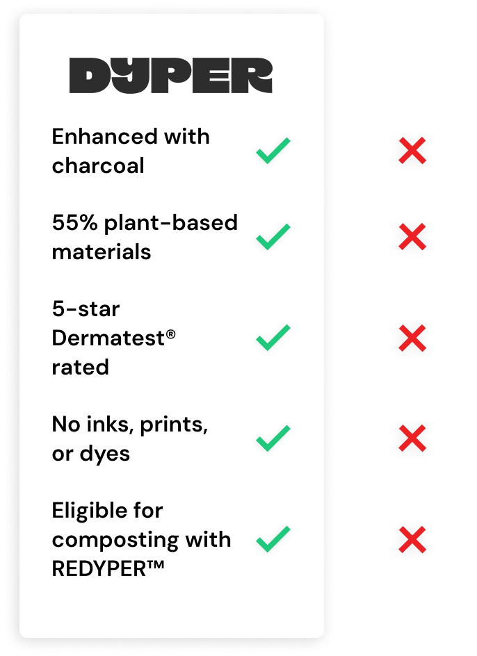 Components: 38% Wood Fibers, 22% Sodium Polyacrylate, 17% Charcoal Enhanced Plant Based Nonwoven, 7% PP, 5% PBAT/Cornstarch Film, 4% Adhesive, 2% Elastics, 2% PLA, 2% PET, <1% Other
