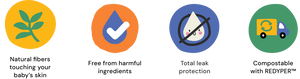 Components: Elemental Chlorine Free wood pulp from sustainably managed forests; sodium polyacrylate; backsheet and topsheet nonwoven made from bamboo viscose; certified compostable outerfilm made of plant-derived materials and additives; polypropylene nonwoven acquisition layer; full coverage waistband made of polyolefin/polypropylene; adhesives; elastics; wetness indicator